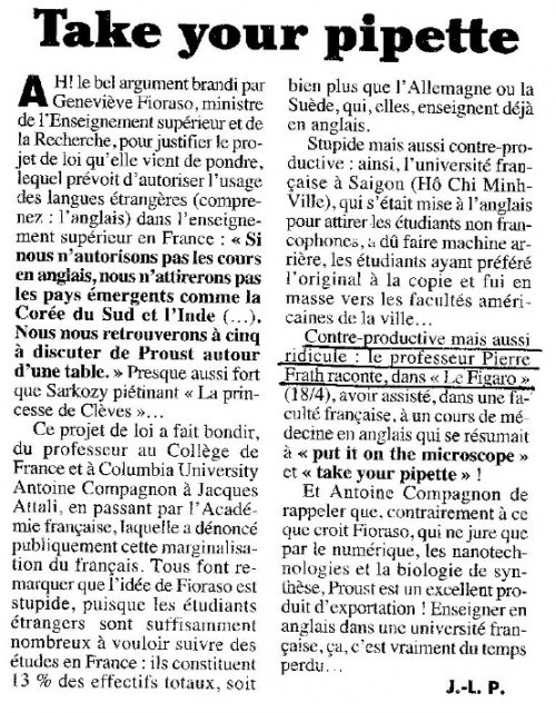 Accueil > Revue de presse > Take your pipette - Jean-Luc Porquet, le Canard Enchaîné, 24 avril (...)