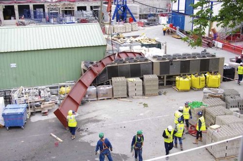 Un accident s’est produit à dix mètres du bâtiment de la Vie Étudiante de Paris 6. Les sangles rallongeant les élingues de l’immense grue portant un immense arc-boutant métallique de plusieurs tonnes ont lâché avant 11 heures le 28 mai au matin, et l’arc-boutant s’est écrasé au sol.
