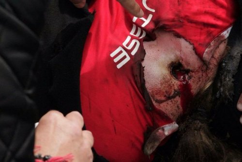 Jointe par téléphone, C. – qui elle aussi n’a pas voulu que son nom apparaisse – est plus précise. « Il y avait des affrontements qui venaient tout juste d’avoir lieu. On voulait rejoindre le groupe de manifestants qui se trouvaient à l’avant pour ne pas voir la manifestation séparée en deux, donc on était en train de courir. Je me suis retournée quand j’ai entendu un bruit. Le mec qui était juste derrière moi s’est effondré avec un bruit épouvantable, un “pschiiiiit”. Il avait un truc fiché dans le dos, entre la colonne et l’omoplate, qui faisait énormément de fumée. Quelqu’un lui a enlevé et il y avait un trou béant dans son dos, son t-shirt avait brûlé. »
