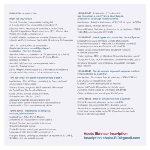 En cause donc, la participation au colloque d’un certain nombre d’associations et collectifs jugés controversés, citons pêle-mêle le CCIF (Collectif contre l’islamophobie), l’EMF (Étudiants Musulmans de France), la CRI (Coordination contre le racisme et l’islamophobie)... Signalons avant toute chose que le colloque est organisé par la chaire “Égalité, inégalités et discriminations” de l’université Lyon 2 et l’Institut des Etudes du Travail de Lyon (IETL) et par l’Institut Supérieur d’Étude des Religions et de la laïcité (ISERL). Il s’inscrit donc dans les travaux de recherche portés par ces structures, mais également dans un débat citoyen portant sur les inégalités et discriminations. Comme indiqué sur le programme du colloque : “La société française est amenée à s’interroger : au-delà d’un développement de l’islamophobie, la persistance d’inégalités, l’ampleur des discriminations, la remise en débat de mesures portant atteinte aux droits des femmes, les incitations à la haine, l’essor de manifestations homophobes ou d’actes racistes et antisémites interpellent les citoyen.nes quant aux conditions d’exercice du vivre et de l’agir ensemble dans le respect de l’altérité. Ces enjeux sont au coeur même de la notion de laïcité. Le monde universitaire, dans toutes ses composantes, est concerné au premier chef, tant dans son fonctionnement, dans l’égalité d’accès au savoir que dans la recherche. Cette articulation entre le militantisme pour les droits humains et la réflexion universitaire vient montrer que les phénomènes qui préoccupent la société font écho à l’intérêt porté par l’université aux problématiques sociales. Il n’existe pas de cloisonnement hermétique entre ces deux mondes qui au contraire se complètent pour la construction d’une collectivité responsable et citoyenne.”